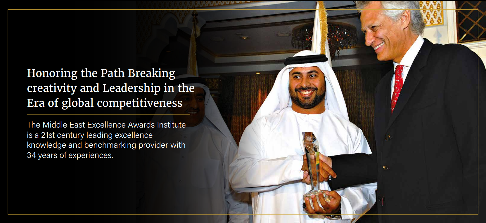 The Middle East Excellence Awards Institute is a 21st-century leading excellence knowledge and benchmarking provider with 34 years of experience. About 34 years ago, The Institute has embarked on a global excellence development journey to accentuate the regions organization's administrative efficiency, leadership, social, economic, media, technological and knowledge management developments, organizational integration systems, and economic knowledge based on the foundations of modern knowledge and in line with the global Excellence competitiveness standards. The Institute is committed to recognizing and honoring excellence and recognizes leaders for their commitment to pursuing leadership, excellence, and innovation. And those whose accomplishments have made significant differences in the remarkable growth and development of the business sector and regional and global economy. Read More